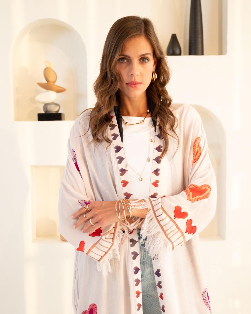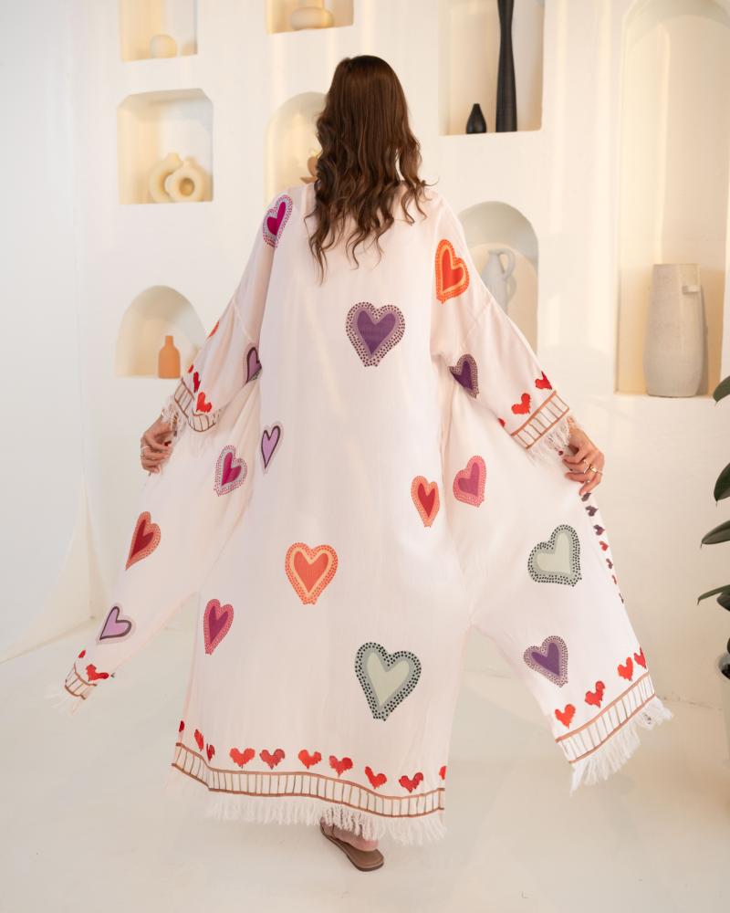 كيمونو صيفي هو الاختيار المثالي لإطلالة يومية تجمع بين الأناقة والراحة. بفضل قماشه الناعم ونقشة القلوب الحصرية، يقدم لك تصميمًا فريدًا يعكس لمسة من الجمال البسيط والأنثوي.